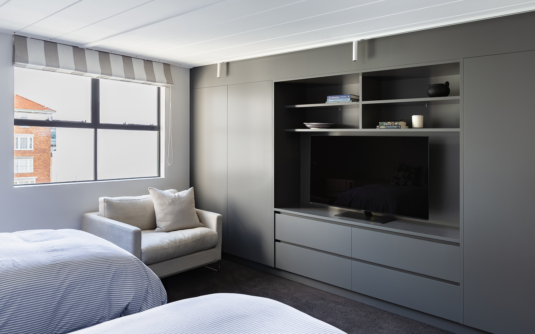 The residential apartment on the south side of the top floor was in dire need of an upgrade. The dated 2 bedroom, 2 bathroom space was reimagined into the 3 bedroom, 2 bathroom showpiece that it is today. The stairwell was re-positioned to create space for the additional bedroom as well as en suite and walk in wardrobe. This change also took advantage of the views out to the top of the Coromandel. It is a light, bright, airy space fitted with automatic skylights throughout and a ducted heat-pump for those cold winter months.